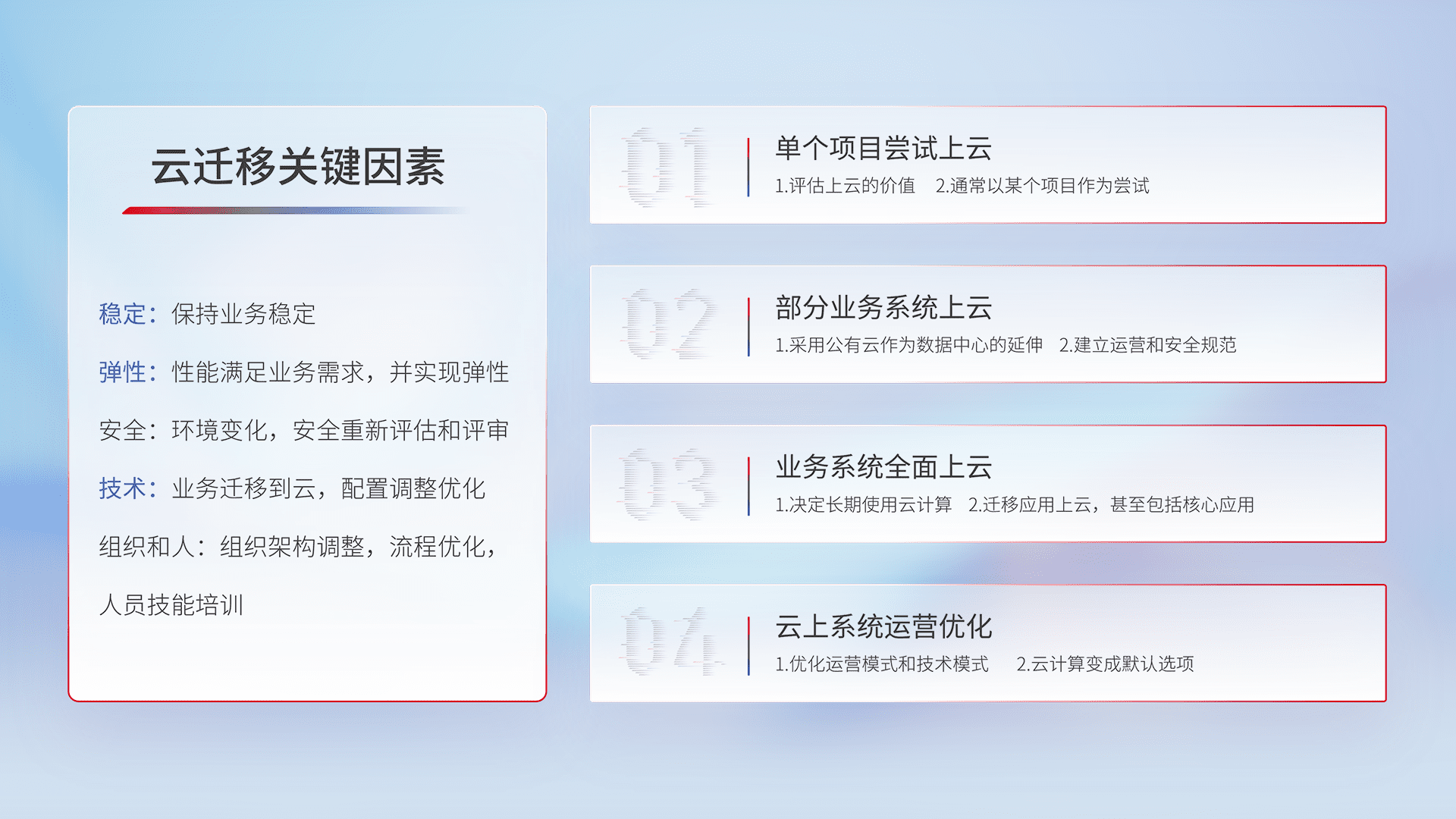 结合实际业务,,,从规划设计、、、、云平台选型、、、云原生改造、、数据迁移、、、集成交付,,,,迁移全过程为客户识别最佳上云路径,,做好风险识别管理,,,,设计网络架构、、、身份权限、、、安全审计合规、、、操作审计、、日志审计、、监控告警策略、、、多站点容灾设计等,,,对云上基础设施进行整体规划,,提升IT治理水平,,,以满足弹性、、、、高可用、、、、高性能的需求。。。。