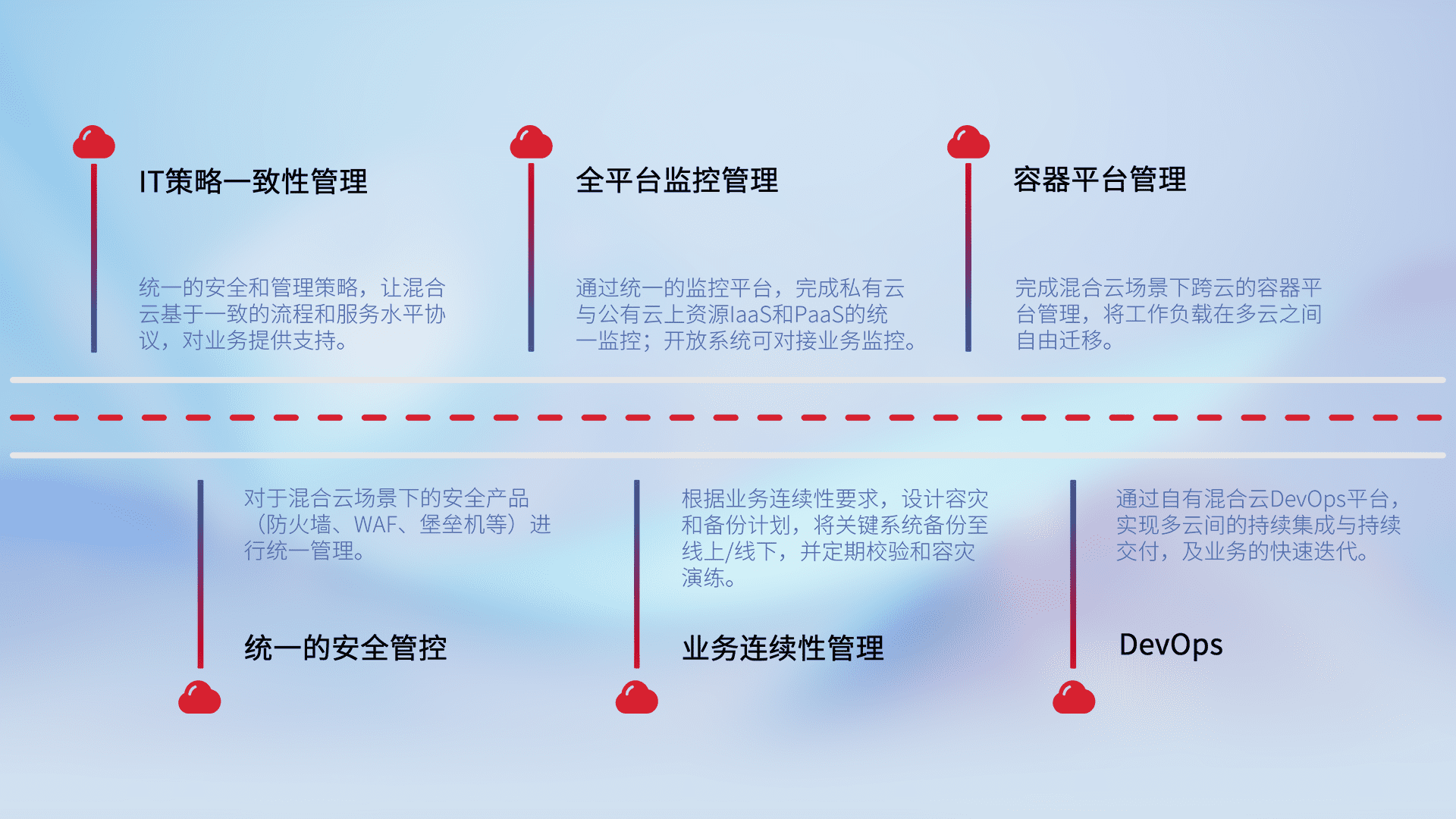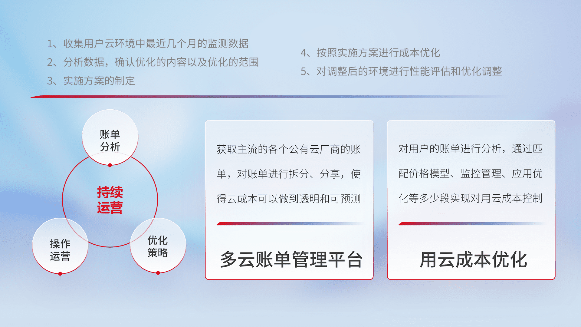 通过多云纳管,,以统一的资源数据模型把客户的云资源进行抽象和封装,,,,进而实现对多云资源的统一操作,,保障云资源管理的可靠性、、稳定性与可用性。。。量身定制化运维内容,,配置、、、、开发运维、、补丁管理、、、备份、、、、监控、、、、认证和访问管理、、、审计和日常巡检等,,,保障在用云过程中的可靠度,,,,稳定度以及高可用率。。。。